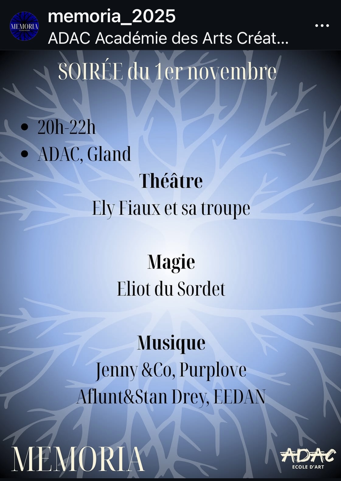 Gland – Festival de tous les arts sur le thème de la mémoire, les 25-26 octobre et 1er et 2 novembre 2025.
